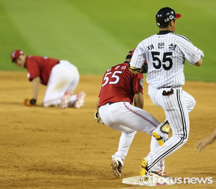 (서울=포커스뉴스) 19일 서울 잠실구장에서 열린 2016 프로야구 KIA-LG 경기 9회말 2사 1루에서 LG 채은성이 1루 강습 내야안타를 치고 1루 베이스를 밟고 있다.