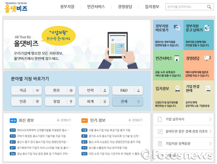 (서울=포커스뉴스)대한상공회의소가 국내기업의 정부지원제도 활용 편의성을 높이기 위해 부처별·지자체별 기업지원제도를 한 곳에 총망라한 기업지원제도 검색사이트 '올댓비즈'를 구축, 20일 정식 오픈했다.