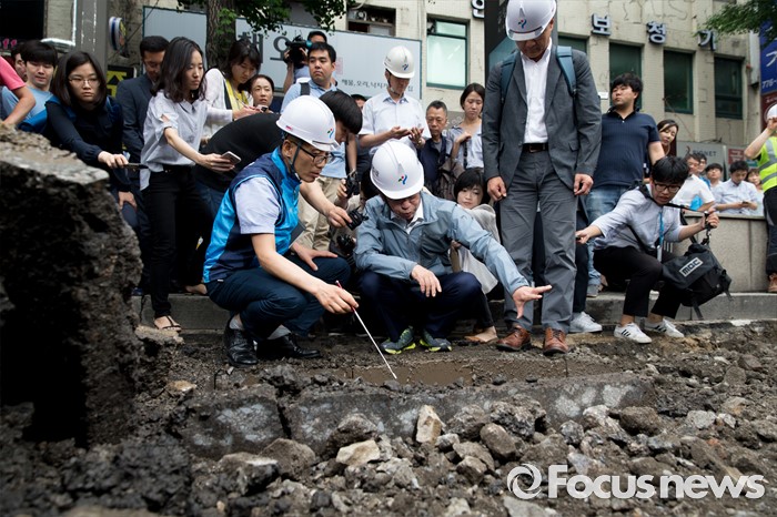 (서울=포커스뉴스) 박원순 서울시장이 20일 오전 서울역 인근 도로에서 동공 굴착 원인조사 및 복구과정을 점검하고 있다.