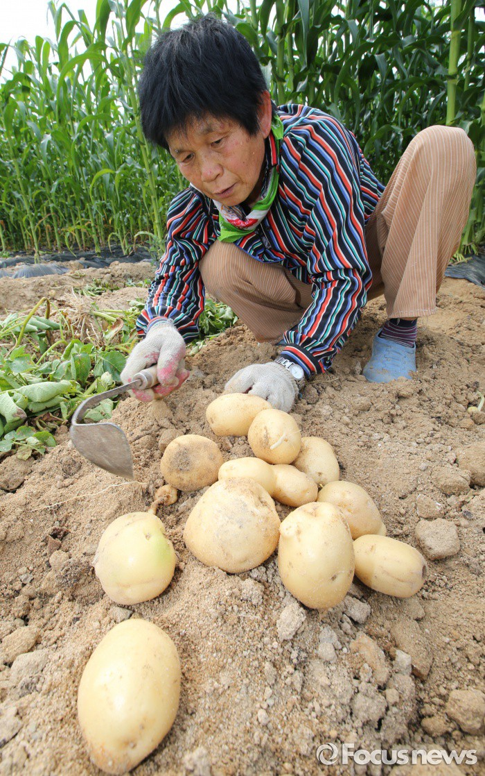 (괴산-포커스뉴스) 장마철을 앞두고 20일 오후 충북 괴산군 들녘에서 농민들이 감자를 수확하고 있다.