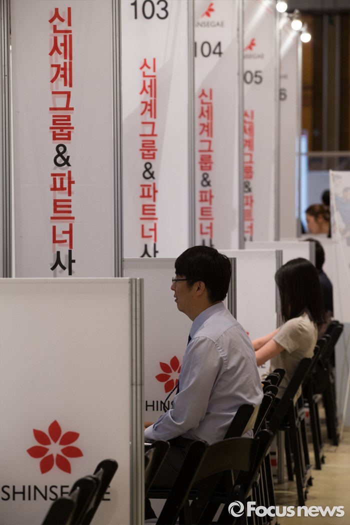 (서울=포커스뉴스) 21일 오후 서울 강남구 코엑스 D2홀에서 열린 신세계그룹&파트너사 채용박람회에서 구직자들이 상담을 하고 있다.