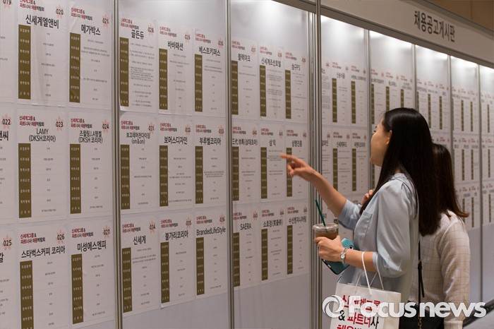 (서울=포커스뉴스) 21일 오후 서울 강남구 코엑스 D2홀에서 열린 신세계그룹&파트너사 채용박람회에서 구직자들이 채용공고게시판을 보고 있다.