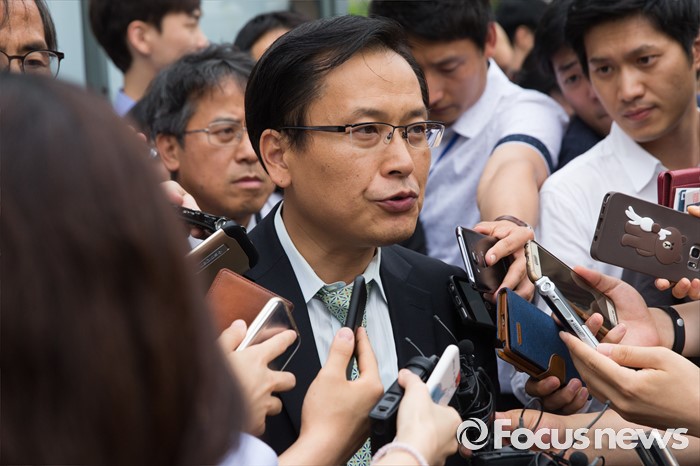 (서울=포커스뉴스) 채희준 민주 사회를 위한 변호사모임 통일위원회 위원장이 21일 오후 서울 서초구 서울중앙지방법원에서 국가정보원 상대 북한 식당종업원 인신구제청구 1차 심문기일을 마친 뒤 취재진 질문에 답하고 있다.