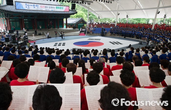 (서울=포커스뉴스) 22일 오전 서울 송파구 서울놀이마당에서 열린 '통일대합창, 625명이 함께하는 평화공감' 행사에 참가한 송파구민들이 합창하고 있다. 이번 행사는 관내 합창단과 노래동아리 등 송파구민 1000여명이 신청해 2주전부터 개별적으로 연습 한 후 통일대합창에 참가 했다.