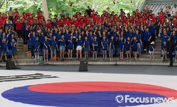 (서울=포커스뉴스) 22일 오전 서울 송파구 서울놀이마당에서 열린 '통일대합창, 625명이 함께하는 평화공감' 행사에 참가한 송파구민들이 합창을 마치고 종이비행기를 날리고 있다. 이번 행사는 관내 합창단과 노래동아리 등 송파구민 1000여명이 신청해 2주전부터 개별적으로 연습 한 후 통일대합창에 참가 했다.