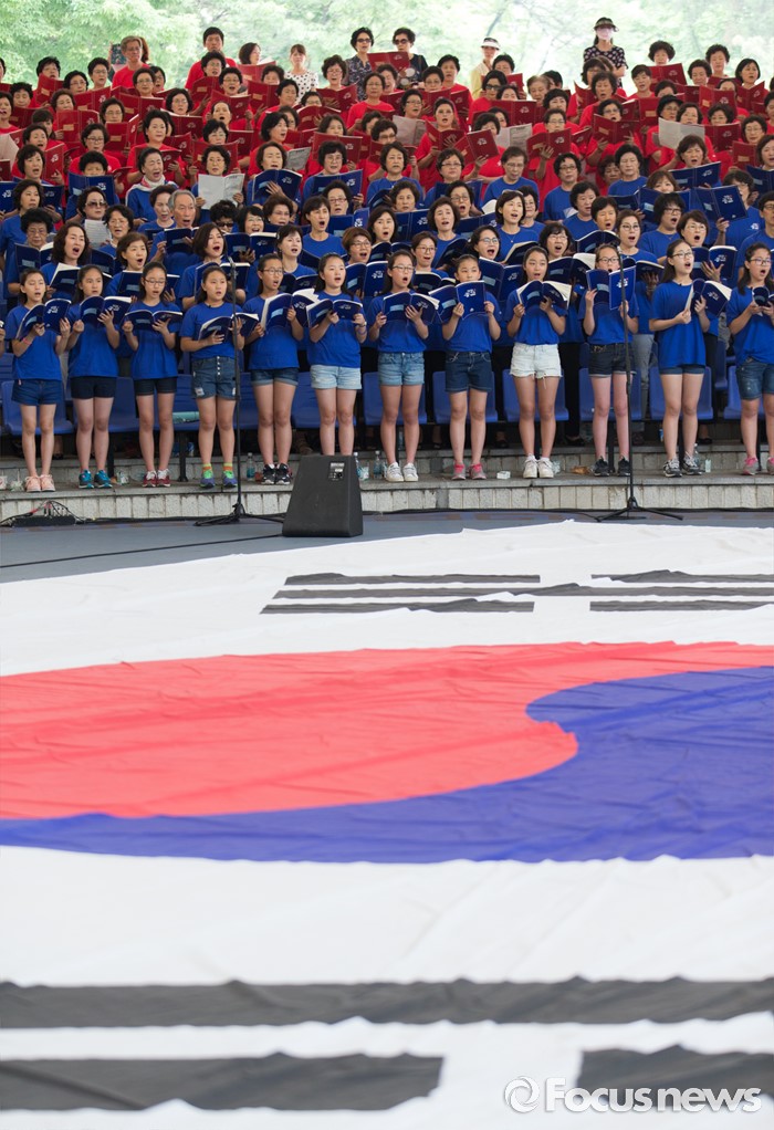 (서울=포커스뉴스) 22일 오전 서울 송파구 서울놀이마당에서 열린 '통일대합창, 625명이 함께하는 평화공감' 행사에 참가한 송파구민들이 합창하고 있다. 이번 행사는 관내 합창단과 노래동아리 등 송파구민 1000여명이 신청해 2주전부터 개별적으로 연습 한 후 통일대합창에 참가 했다.
