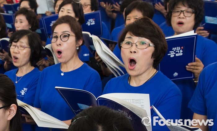 (서울=포커스뉴스) 22일 오전 서울 송파구 서울놀이마당에서 열린 '통일대합창, 625명이 함께하는 평화공감' 행사에 참가한 송파구민들이 합창하고 있다. 이번 행사는 관내 합창단과 노래동아리 등 송파구민 1000여명이 신청해 2주전부터 개별적으로 연습 한 후 통일대합창에 참가 했다.