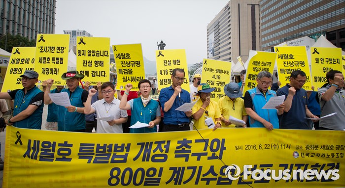 (서울=포커스뉴스) 세월호 참사 800일을 하루 앞둔 22일 오전 서울 종로구 광화문 광장에서 열린 '세월호 특별법 개정 촉구와 800일 계기수업 선포' 기자회견에 참석한 전국교직원노동조합 조합원들이 구호를 외치고 있다.