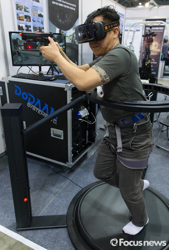 (고양=포커스뉴스) 22일 오후 경기 고양시 킨텍스 7홀에서 열린 2016 로보유니버스 & VR 서밋에 방문한 한 시민이 VR 기기를 체험하고 있다.