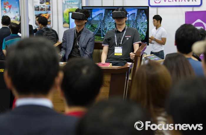 (고양=포커스뉴스) 22일 오후 경기 고양시 킨텍스 7홀에서 열린 2016 로보유니버스 & VR 서밋에 방문한 시민들이 VR 기기를 체험하고 있다.