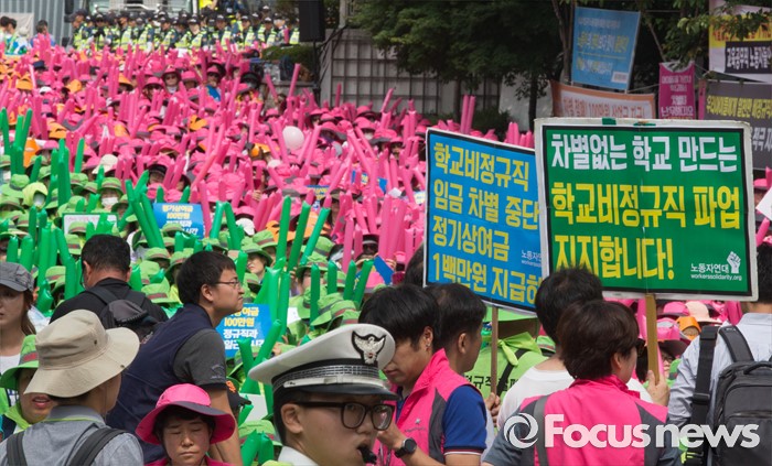 (서울=포커스뉴스) 23일 오전 서울 종로구 서울시 교육청 인근에서 전국학교비정규직 노동조합원과 공공운수노조 전국 교육공무직 본부원들이 '학교급식 인원보강 및 처우개선 철야대기 학교비정규직 처우개선 임단협 승리 총파업 결의대회' 를 하고 있다.