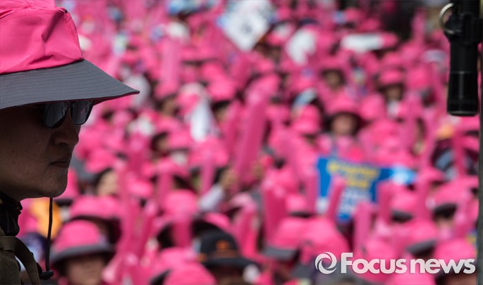 (서울=포커스뉴스) 23일 오전 서울 종로구 서울시 교육청 인근에서 전국학교비정규직 노동조합원과 공공운수노조 전국 교육공무직 본부원들이 '학교급식 인원보강 및 처우개선 철야대기 학교비정규직 처우개선 임단협 승리 총파업 결의대회' 를 하고 있다.