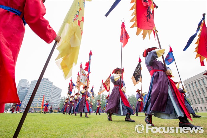 (서울=포커스뉴스) 23일 오후 서울광장에서 열린 '왕궁수문장 20주년 기념행사'에 참석한 관계자들이 대열의식을 재현하고 있다.