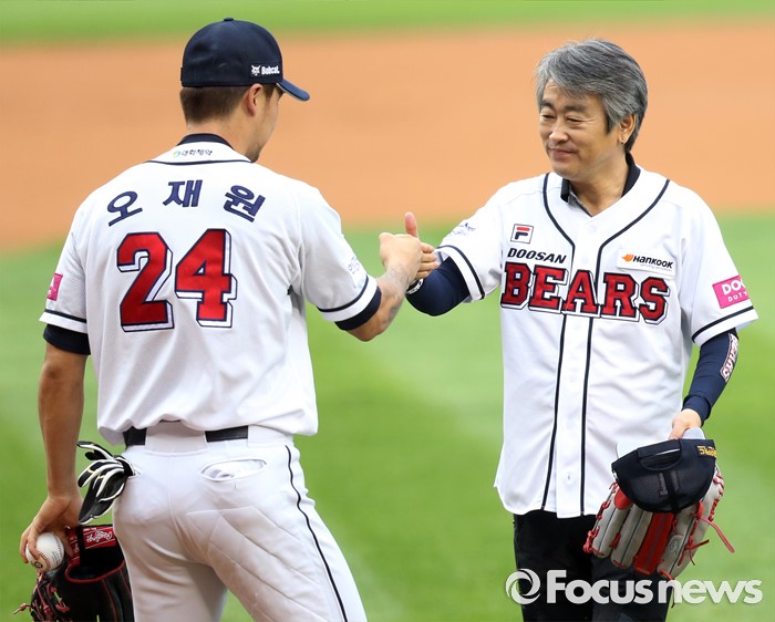 (서울=포커스뉴스) 23일 서울 잠실구장에서 열린 2016 프로야구 kt-두산 경기에서 두산 오재원의 1천 경기 출장 기념식을 갖고 오재원이 시구한 부친 오병현씨와 주먹을 마주치고 있다.