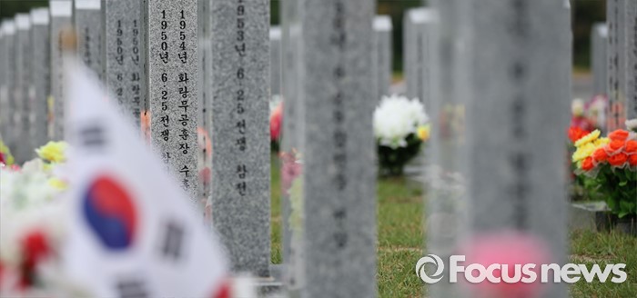 (대전=포커스뉴스) 6·25전쟁 66주년을 하루 앞둔 24일 오후 대전 유성구 국립대전현충원 6.25 전쟁 참전 용사의 묘비 앞에 태극기가 바람에 휘날리고 있다.