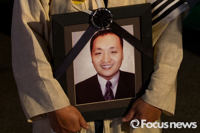 (서울=포커스뉴스) 24일 오후 서울 서초구 현대자동차 본사 앞에서 열린 '유성기업 故 한광호씨 100일ㆍ현대차 진격의 날' 집회에 참석한 고인의 형 국석호씨가 영정을 들고 있다.