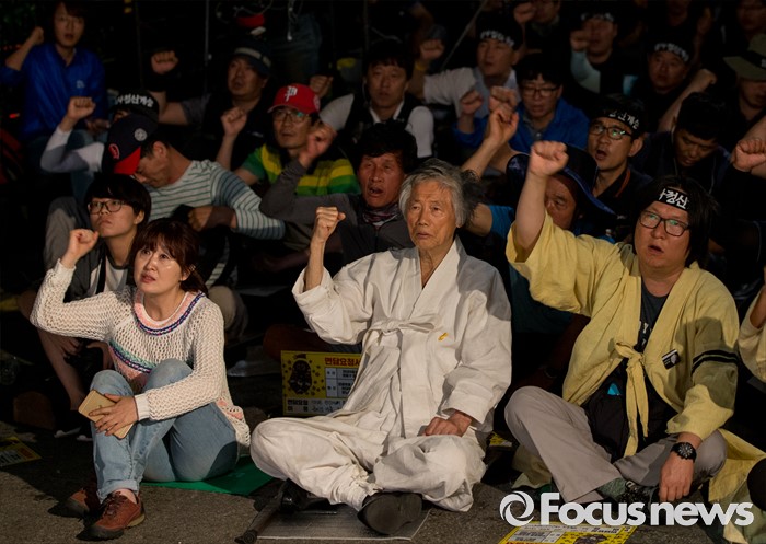 (서울=포커스뉴스) 24일 오후 서울 서초구 현대자동차 본사 앞에서 열린 '유성기업 故 한광호씨 100일ㆍ현대차 진격의 날' 집회에 참석한 백기완 통일문제연구소 소장과 노동자들이 구호를 외치고 있다.