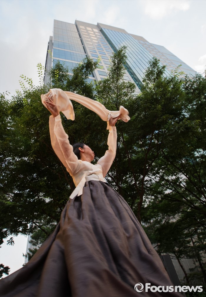 (서울=포커스뉴스) 24일 오후 서울 서초구 현대자동차 본사 앞에서 열린 '유성기업 故 한광호씨 100일ㆍ현대차 진격의 날' 집회에 참석한 서정숙 무용가가 추모공연을 하고 있다.