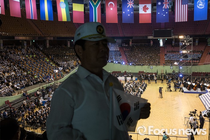 (서울=포커스뉴스) 25일 오전 서울 송파구 잠실실내체육관에서 열린 '6.25전쟁 66주년 기념식'에 참석한 한 시민이 사진을 찍고 있다.