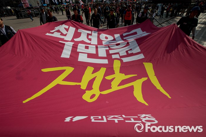 (서울=포커스뉴스) 25일 오후 서울 중구 시청광장에서 열린 '민주노총 전국노동자대회' 참석자들이 최저임금 1만원, 비정규직 철폐를 촉구하며 행진하고 있다.
