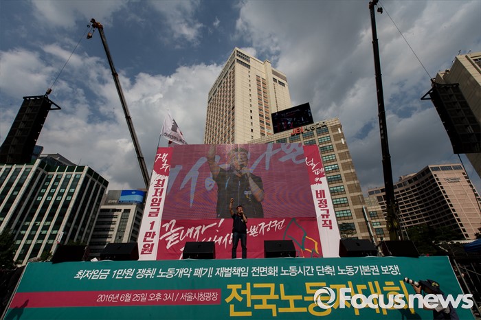 (서울=포커스뉴스) 25일 오후 서울 중구 시청광장에서 열린 '민주노총 전국노동자대회' 사회자가 최저임금 1만원, 비정규직 철폐를 촉구하며 구호를 외치고 있다.
