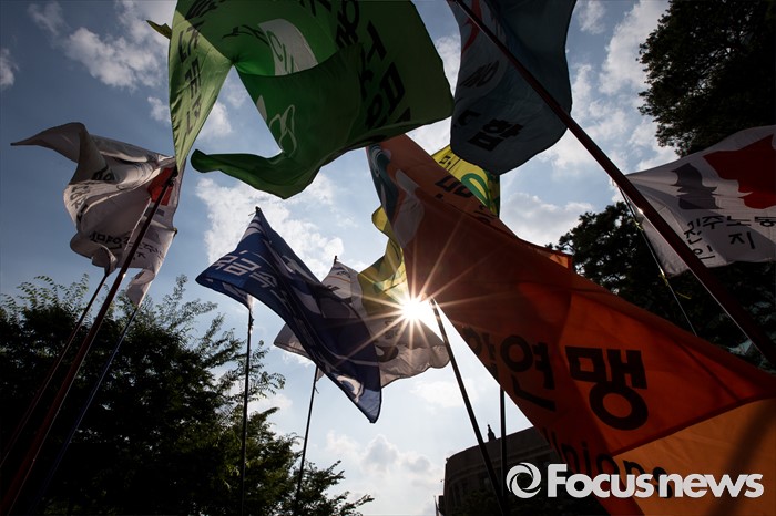 (서울=포커스뉴스) 25일 오후 서울 중구 시청광장에서 열린 '민주노총 전국노동자대회' 참석자들이 최저임금 1만원, 비정규직 철폐를 촉구하며 행진하고 있다.
