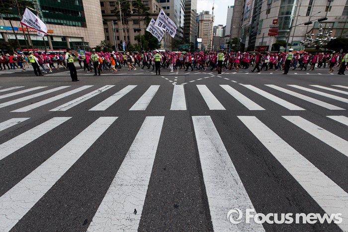 (서울=포커스뉴스) 25일 오후 서울 중구 시청광장에서 열린 '민주노총 전국노동자대회' 참석자들이 최저임금 1만원, 비정규직 철폐를 촉구하며 행진하고 있다.