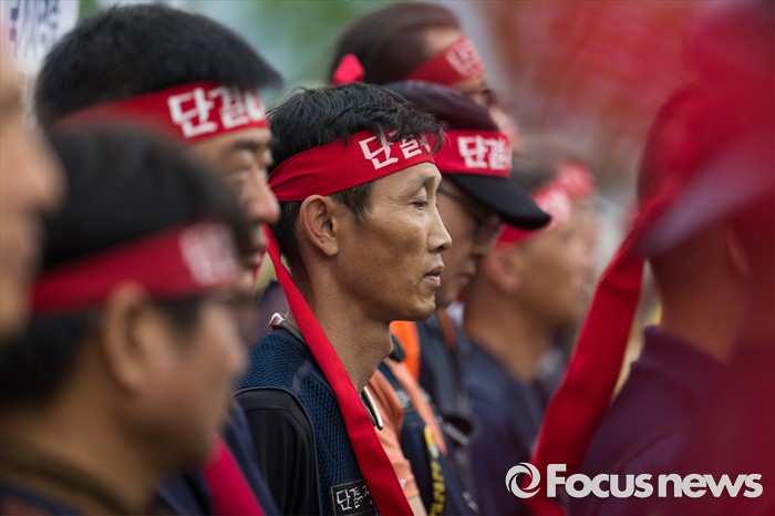(서울=포커스뉴스) 전국건설노동조합 조합원들이 27일 오전 서울 종로구 정부서울청사 앞에서 열린 7.6 총파업 총력투쟁을 선포하는 기자회견에 참석해 빨간 머리끈을 묶고 있다.