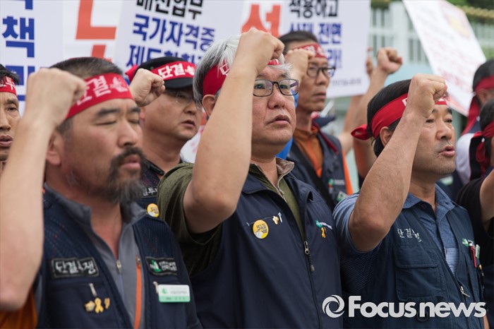 (서울=포커스뉴스) 전국건설노동조합 조합원들이 27일 오전 서울 종로구 정부서울청사 앞에서 7.6 총파업 총력투쟁을 선포하는 구호를 외치고 있다.