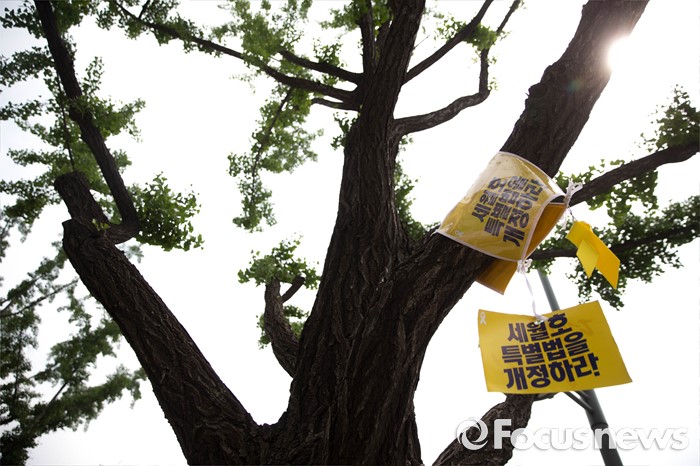 (서울=포커스뉴스) 27일 오후 서울 종로구 정부서울청사 앞에 세월호 특별법 개정을 촉구하는 손피켓이 나무 위에 걸려 있다.