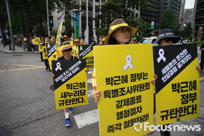 (서울=포커스뉴스) 27일 오후 서울 종로구 정부서울청사 앞에 세월호 관계자들이 세월호 특별법 개정 및 선체 인양을 촉구하는 기자회견을 하기 위해 청운동주민센터 앞으로 이동하고 있다.