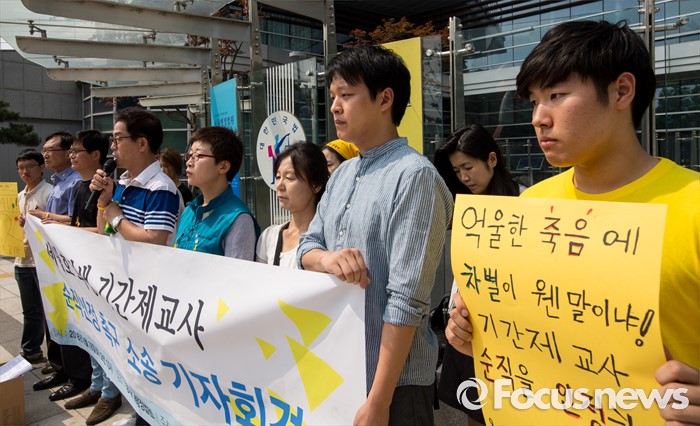 (서울=포커스뉴스) 28일 오전 서울행정법원 앞에서 세월호 희생 기간제교사 순직인정촉구대책위 회원들이 순직 인정 촉구 소송 기자회견을 갖고 있다.