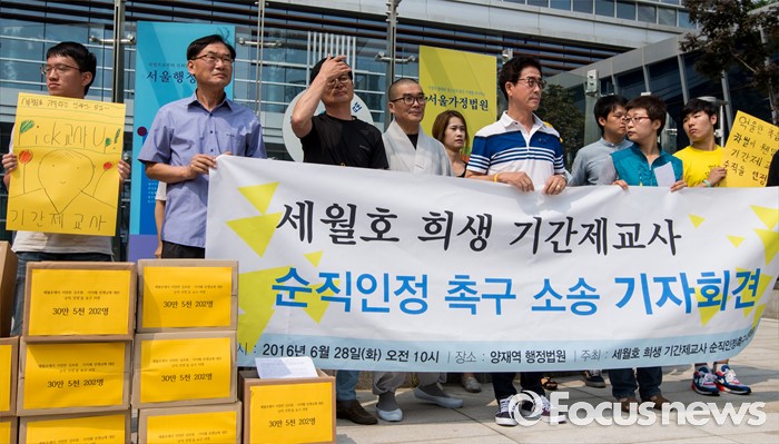 (서울=포커스뉴스) 28일 오전 서울행정법원 앞에서 세월호 희생 기간제교사 순직인정촉구대책위 회원들이 순직 인정 촉구 소송 기자회견을 갖고 있다.