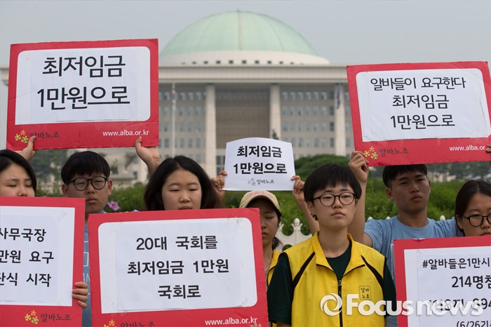 (서울=포커스뉴스) 28일 오전 서울 여의도 국회 앞에서 알바노조 조합원들이 최저임금 1만원 요구 용윤신 사무국장 단식농성 시작 기자회견을 하고 있다.