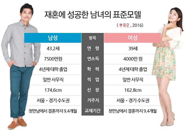 男-평균 재혼 연령 43.2세, 年소득 7500만원, 4년제 대졸, 키 174.6cm