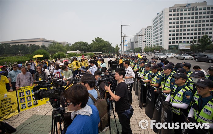 (서울=포커스뉴스) 416가족협의회와 4월16의약속국민연대가 28일 오후 서울 여의도 국회 앞에서 '20대 국회 6월 임시국회에 특별법 개정 촉구' 기자회견을 하고 있다. 경찰들이 기자회견장 앞을 가로막고 있다.
