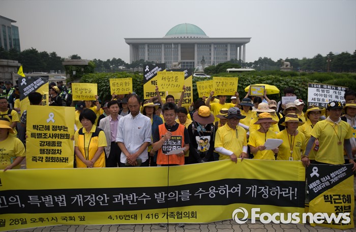 (서울=포커스뉴스) 416가족협의회와 4월16의약속국민연대가 28일 오후 서울 여의도 국회 앞에서 '20대 국회 6월 임시국회에 특별법 개정 촉구' 기자회견을 하고 있다.