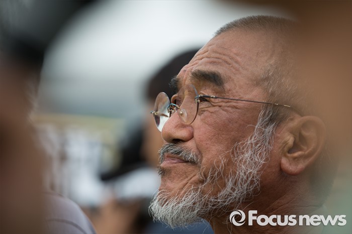 (서울=포커스뉴스)문규현 신부가 세월호 유가족들과 함께 28일 오후 서울 여의도 국회 앞에서 '20대 국회 6월 임시국회에 특별법 개정 촉구' 기자회견을 하고 있다.