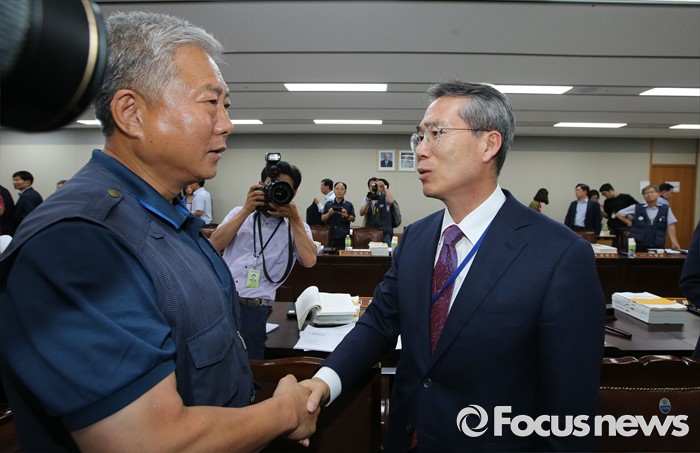 (세종=포커스뉴스) 28일 오후 세종시 정부세종청사 고용노동부 최저임금위원회 전원회의실에서 열린 제7차 전원회의가 정회돼 김동만(왼쪽) 한국노총 위원장이 전원회의실을 방문, 박준성 최저임금위원회 위원장과 악수하고 있다.