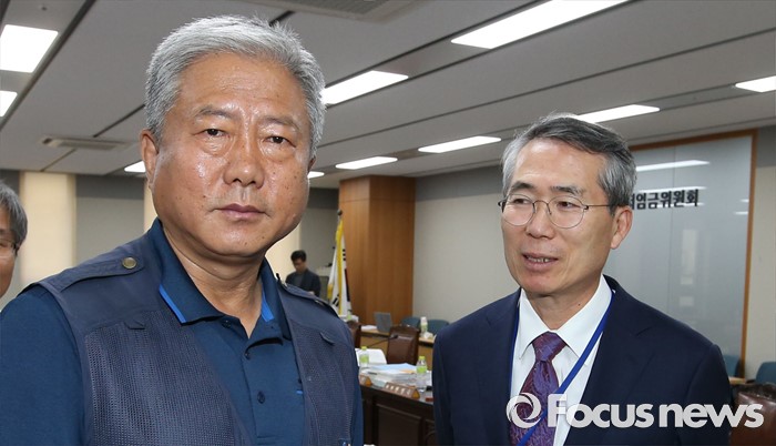(세종=포커스뉴스) 28일 오후 세종시 정부세종청사 고용노동부 최저임금위원회 전원회의실에서 열린 제7차 전원회의가 정회돼, 김동만(왼쪽) 한국노총 위원장이 전원회의실을 방문, 박준성 최저임금위원회 위원장과 대화를 하고 있다.
