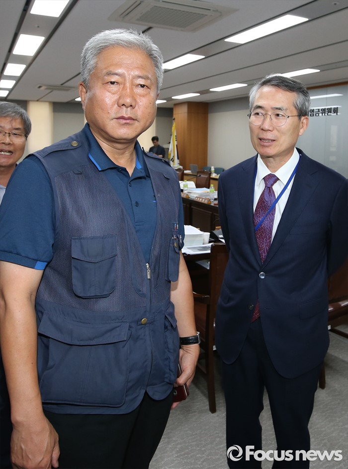 (세종=포커스뉴스) 28일 오후 세종시 정부세종청사 고용노동부 최저임금위원회 전원회의실에서 열린 제7차 전원회의가 정회돼, 김동만(왼쪽) 한국노총 위원장이 전원회의실을 방문, 박준성 최저임금위원회 위원장과 대화를 하고 있다.