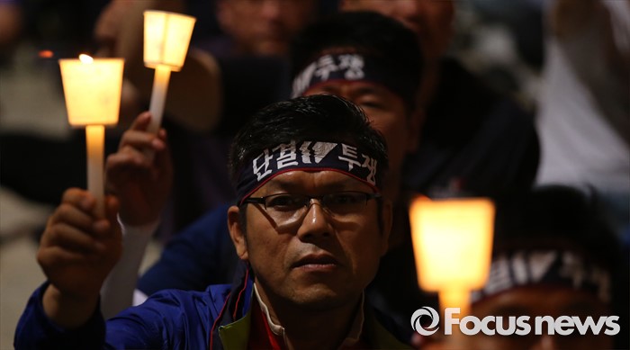 (세종=포커스뉴스) NH 농협중앙회노동조합원들이 28일 오후 세종시 정부세종청사 농림축산식품부 앞에서 농협법 개정 반대하는 1박 2일 노숙집회에서 촛불을 들고 있다.