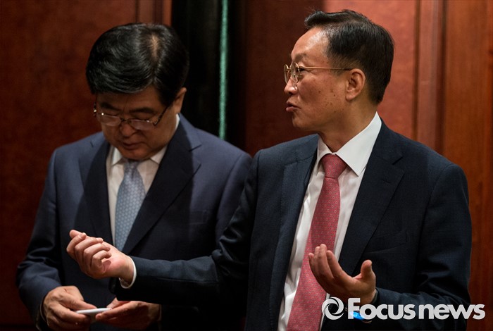 (서울=포커스뉴스) 29일 오전 서울 강남구 그랜드 인터콘티넨탈 호텔에서 열린 산업부 주최 조선업계 CEO ·전문가 간담회에 참석한 박대영(오른쪽) 삼성중공업 사장이 기자들과 대화하고 있다.