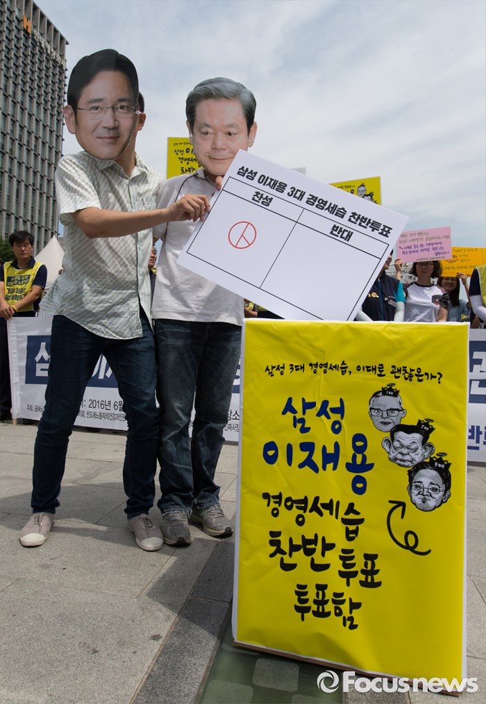 (서울=포커스뉴스) 29일 오전 서울 광화문광장에서 전국금속노동조합 삼성전자서비스지회와 반올림, 참여연대 등 시민단체들이 '삼성 이재용 3대 세습, 이대로 괜찮은가?' 찬반투표 선포 기자회견 후 투표 참여 독려 퍼포먼스를 펼치고 있다.