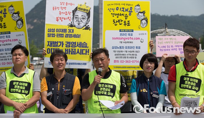 (서울=포커스뉴스) 라두식(가운데) 금속노조 삼성전자서비스지회 지회장이 29일 오전 서울 광화문광장에서 열린 '삼성 이재용 3대 세습, 이대로 괜찮은가?' 찬반투표 선포 기자회견에 참석해 발언하고 있다.