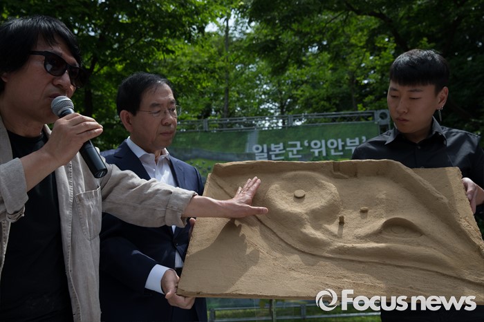 (서울=포커스뉴스) 29일 오전 서울 중구 예장동 옛 통감관저 터에서 열린 일본군 위안부 피해자 추모공원 '기억의 터' 기공식에 참석한 임옥상(왼쪽) 화백이 공원 조성 계획을 설명하고 있다.