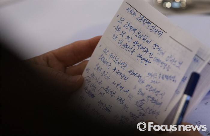 (서울=포커스뉴스) 30일 오전 서울 중구 프레스센터에서 열린 제45차 고용정책심의회에 참석한 이기권 고용노동부 장관이 모두발언이 적힌 수첩을 읽고 있다.