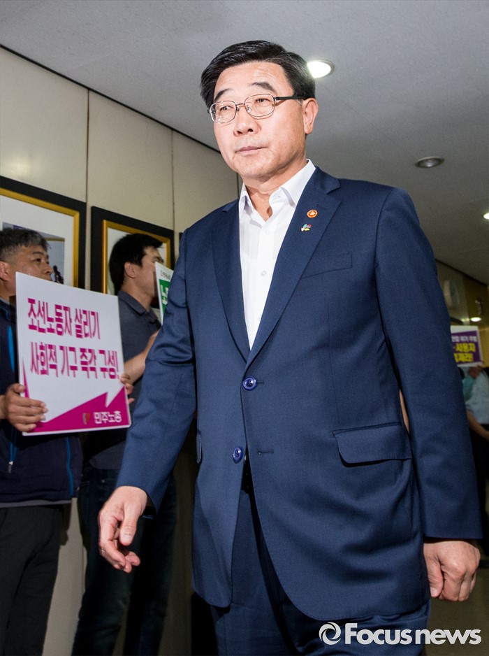 (서울=포커스뉴스) 30일 오전 서울 중구 프레스센터에서 열린 제45차 고용정책심의회에 이기권 고용노동부 장관이 참석하는 가운데 양대노총 관계자들이 구조조정 중단을 요구하는 구호를 외치고 있다.