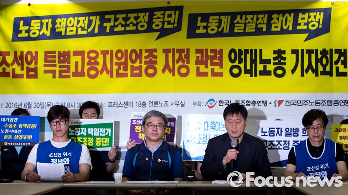 (서울=포커스뉴스) 30일 오전 서울 중구 프레스센터에서 열린 조선업 특별고용지원업종 지정 관련 양대노총 기자회견에 참석한 박대수 한국노총 부위원장이 발언하고 있다.