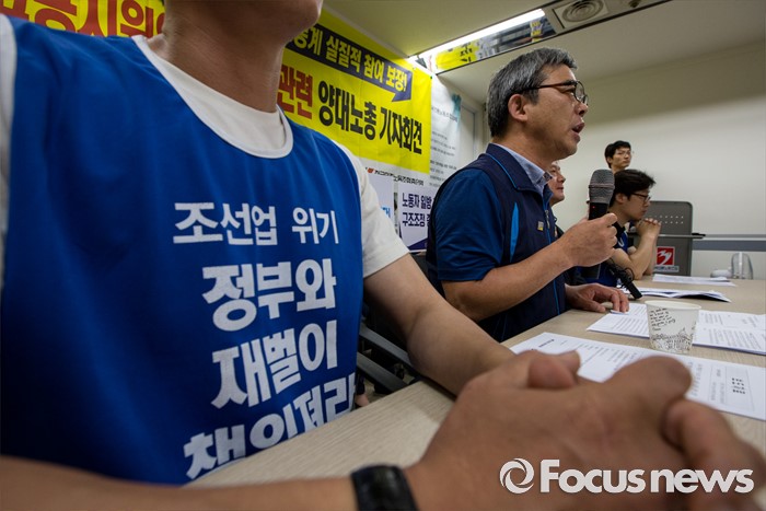 (서울=포커스뉴스) 30일 오전 서울 중구 프레스센터에서 열린 조선업 특별고용지원업종 지정 관련 양대노총 기자회견에 참석한 김종인 민주노총 부위원장이 발언하고 있다.